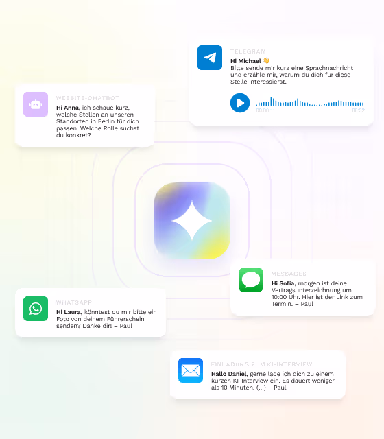 KI-Agenten übernehmen den gesamten Recruiting-Prozess end-to-end: Bewerberkommunikation, Screening, KI-Interviews, Terminierung und Onboarding – alles autonom, in Echtzeit und auf allen Kanälen.