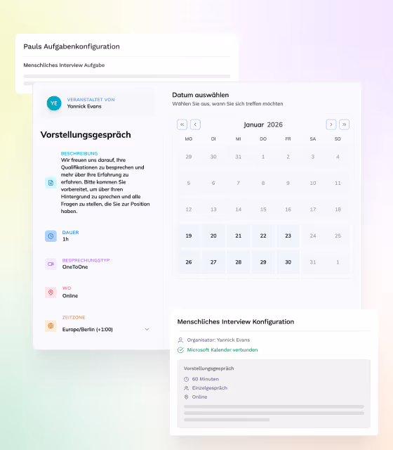 ATS-, HR- und Kalendersysteme verbinden sich über offene APIs. Prozesse laufen durchgängig – ohne IT-Aufwand, ohne Brüche.