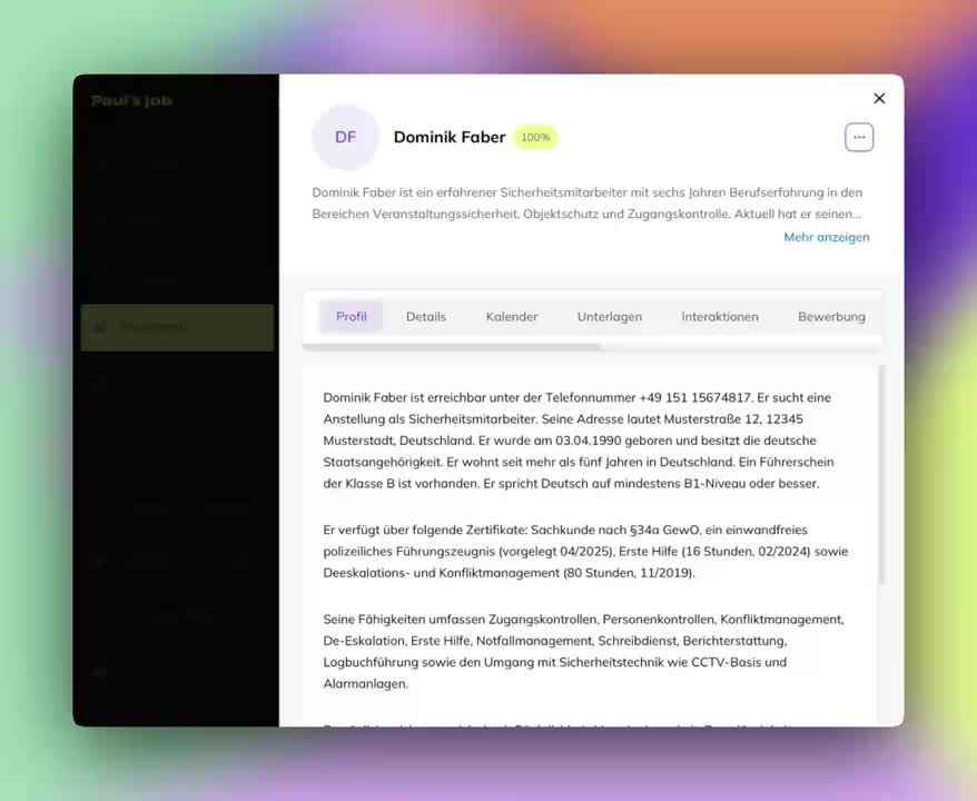 Paul doesn’t just collect applications — he understands them. Every message, document and voice note is analyzed and transformed into a structured candidate profile. This saves candidates and recruiters hours of work.