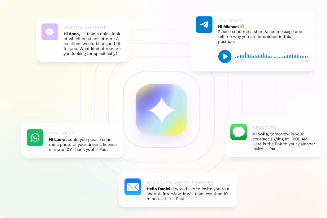 WhatsApp, phone, SMS, email, website – Paul communicates instantly and personally on the channel the candidate prefers. In 20+ languages.