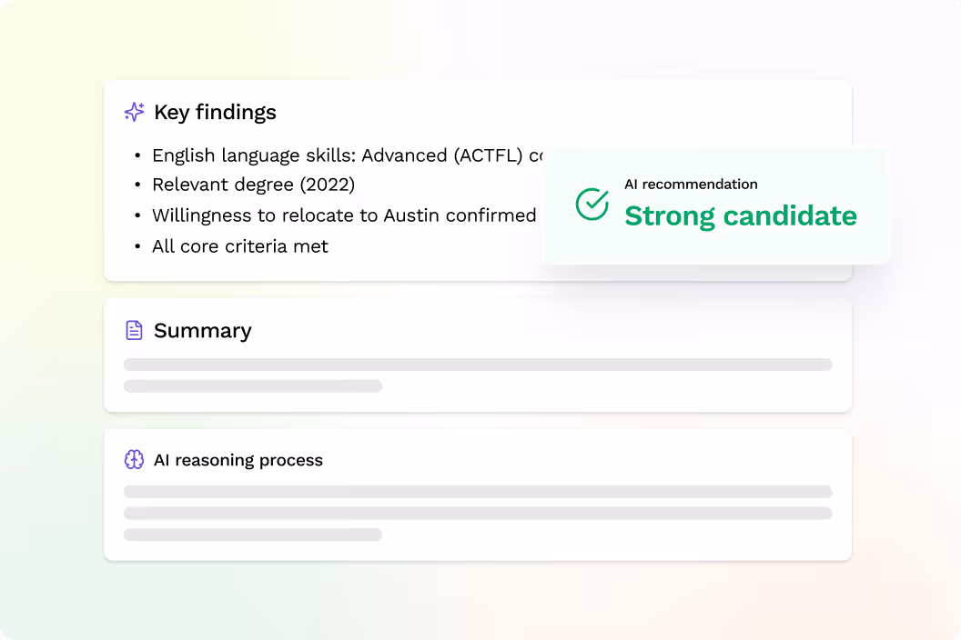 Structured, job-relevant interviews – even for complex roles. With full documentation, audio, and clear scorecards to drive decisions.