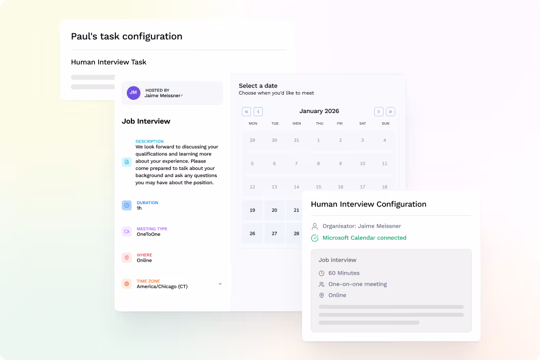 An AI agent is an AI that autonomously pursues a defined goal – unlike simple chatbots, which only react to inputs. Paul's AI agents run candidate conversations, review documents, make screening decisions, and coordinate interviews on their own. They act autonomously, while HR retains full control at all times.