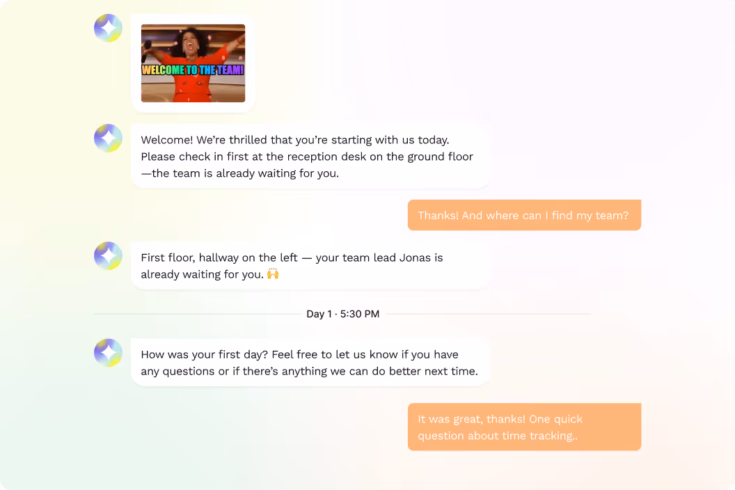 From day one: answers questions, collects documents, provides orientation – automated, personal, and right through those critical first weeks.