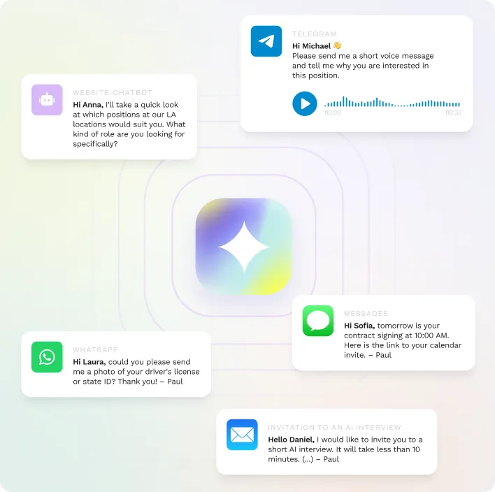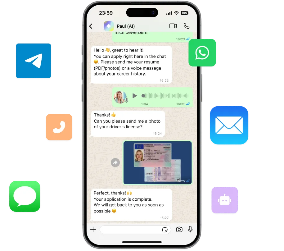 Paul responds to inquiries instantly, holds real conversations across WhatsApp, Telegram, web, email, SMS, and phone – keeping the dialogue going with zero wait time. Candidates feel engaged, the process accelerates, and more applications get completed.