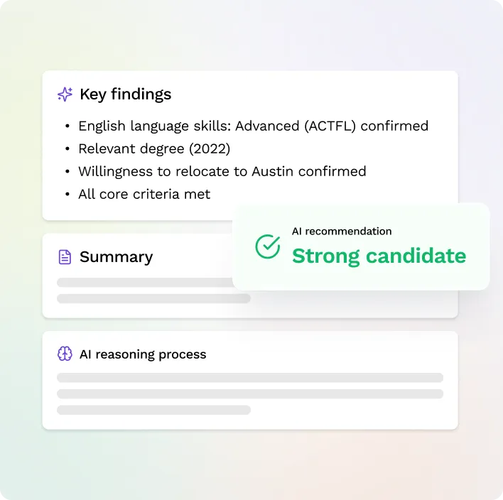 AI agents that autonomously manage the entire recruiting process – from first contact, document verification, and AI interviews to the hiring appointment. End-to-end in under one hour.