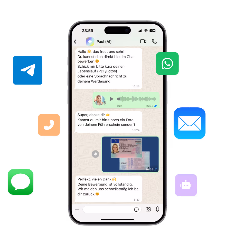 Paul beantwortet Anfragen unmittelbar, führt echte Gespräche über WhatsApp, Telegram, Website, E-Mail, SMS, Telefon und hält den Dialog ohne Wartezeit am Laufen. Bewerber:innen fühlen sich abgeholt, der Prozess gewinnt Tempo und es entstehen mehr vollständige Bewerbungen.