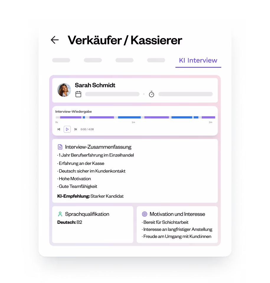 Paul führt strukturierte Interviews, prüft alle relevanten Kriterien vollständig und bewertet Antworten objektiv – inklusive Dokumentation als Text und Audio.